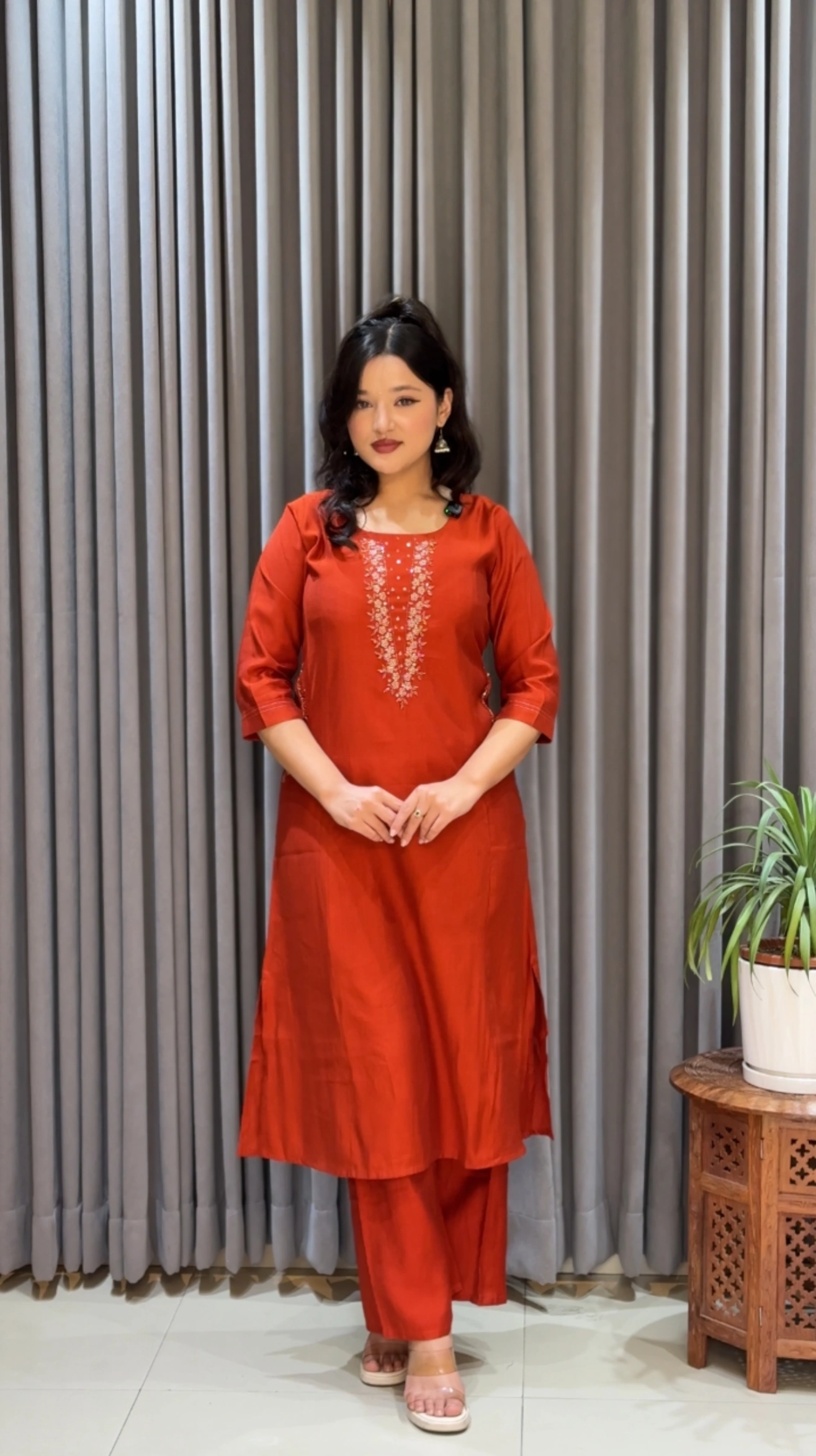 Bring elegance and comfort to your ethnic wardrobe with this stylish Side Pocket Kurthi with Plazo in a beautiful rust shade. Crafted from premium raw silk fabric, this outfit offers a rich texture with a subtle sheen that enhances its sophisticated and graceful appeal.